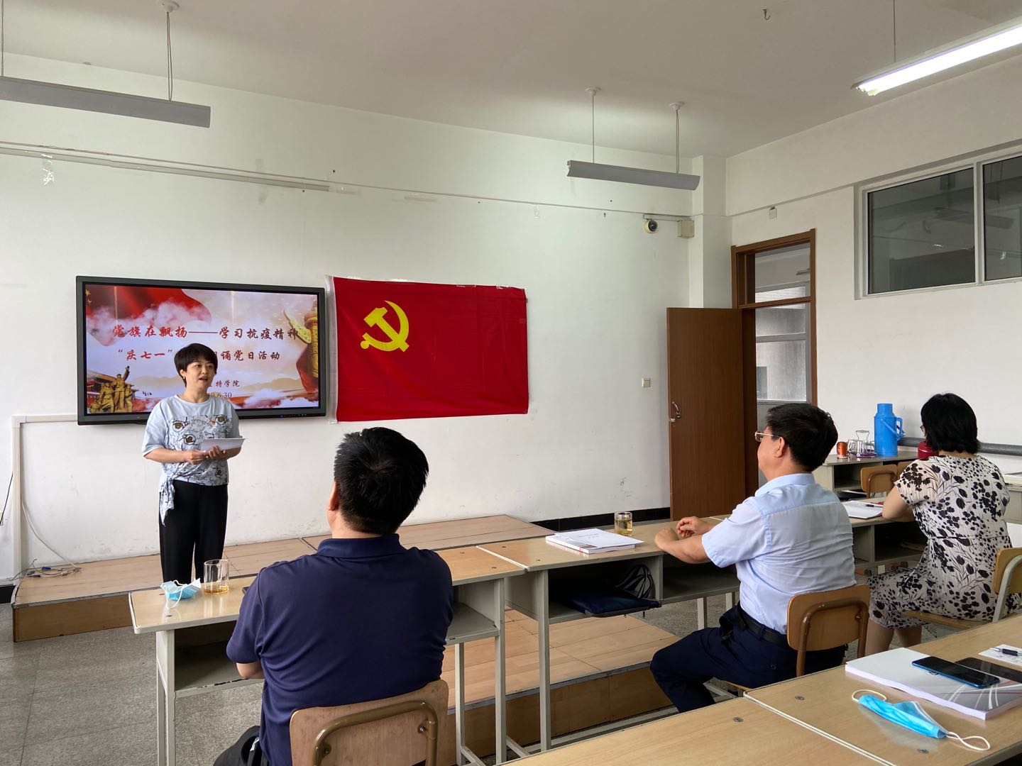 2020年6月30日上午,我院党总支组织开展了“党旗在飘扬——学习抗疫精神”庆七一主题党日活动,校党委书记王亦农同志作为联系我院党总支的校领导参加了此次活动。会上,各党支部奉献了精彩、感人的朗诵节目,讲述不平凡的抗疫故事,歌颂伟大的抗疫精神,彰显中国特色社会主义的道路自信、理论自信、制度自信、文化自信,抒发爱党爱国爱人民爱社会主义的深厚情感。党总支还组织开展了共产党员重温入党誓词活动。