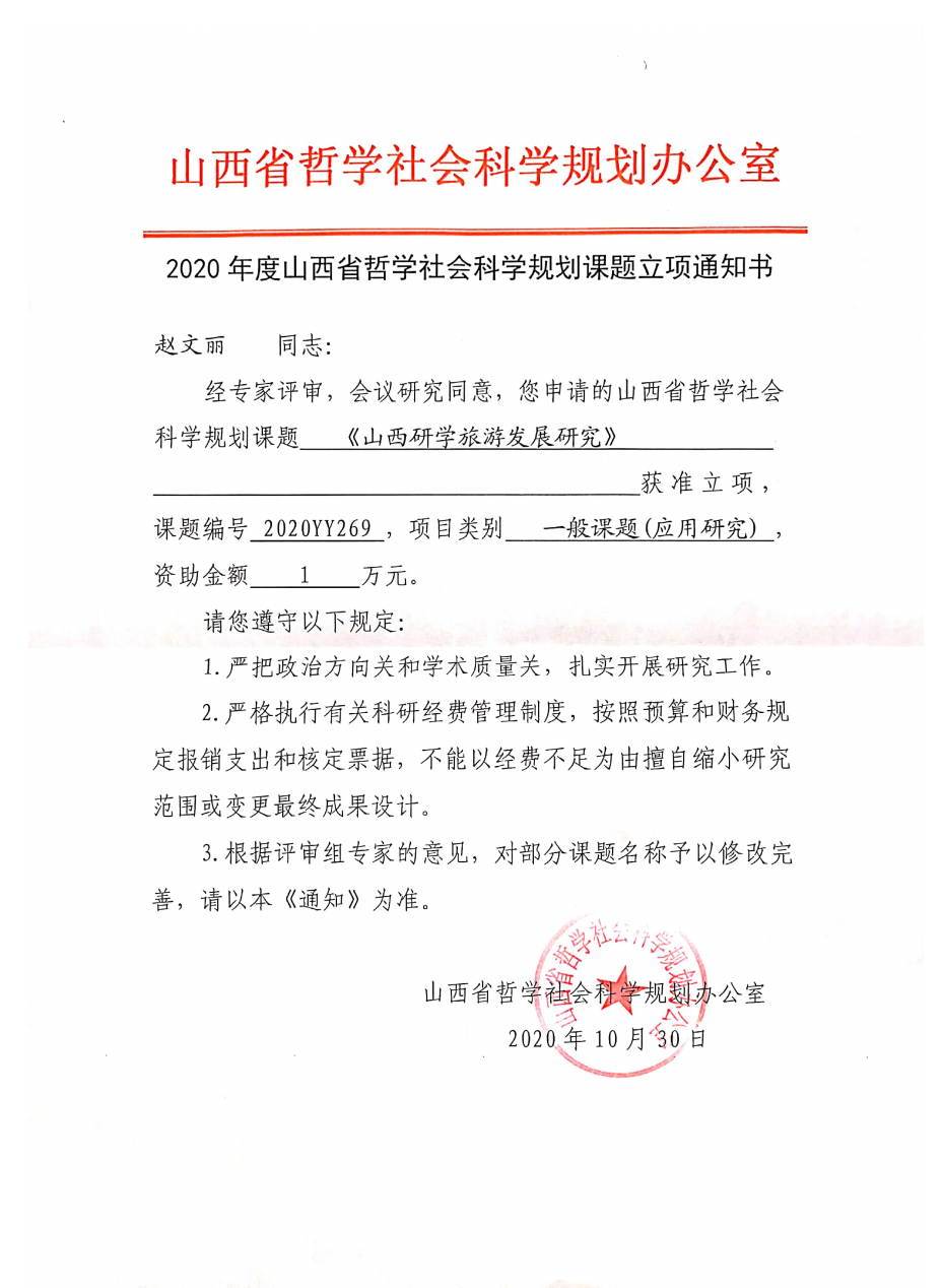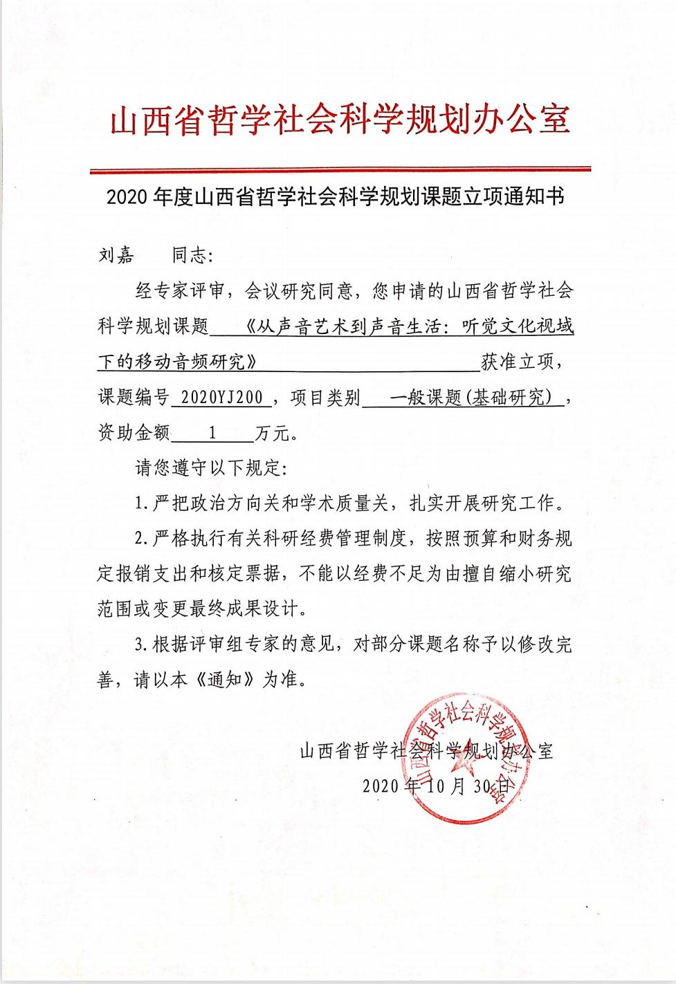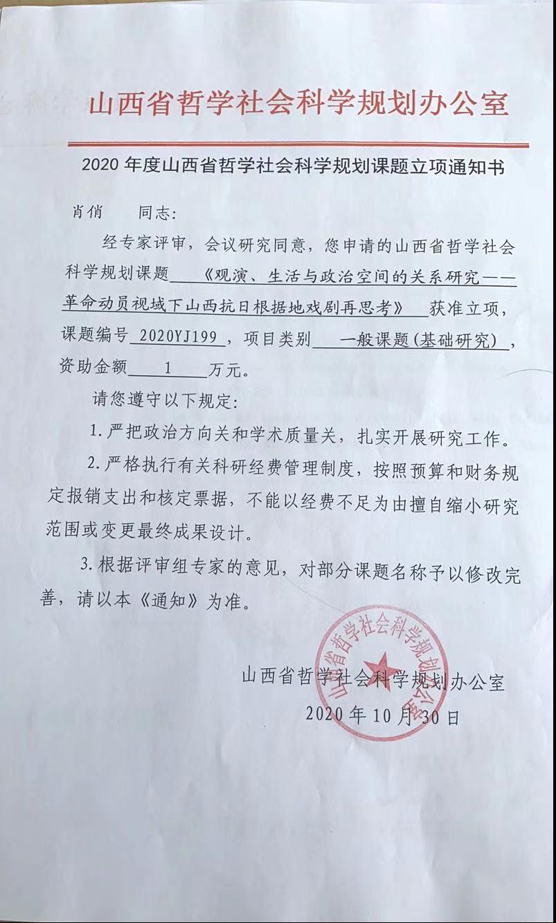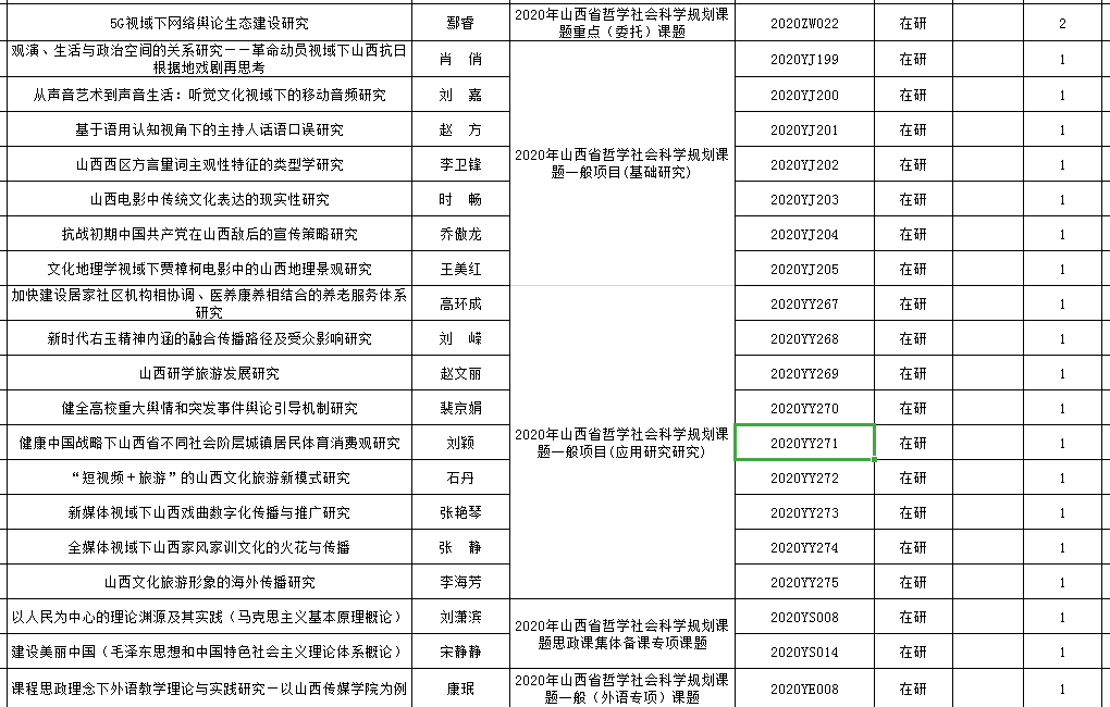 8月中旬,从科研处传来喜讯,2020年度山西省哲学社会科学规划课题立项名单已出,我院6名教师的课题立项。分别是刘嘉老师的《从声音艺术到声音生活:听觉文化视域下的移动音频研究》、赵文丽老师的《山西研学旅游发展研究》、赵方老师的《基于语用认知视角下的主持人话语口误研究》、肖俏老师的《观演、生活与政治空间的关系研究》、时畅老师的《山西电影中传统文化表达的现实性研究》、李卫锋老师的《山西西区方言量词主观性特征的类型学研究》。
