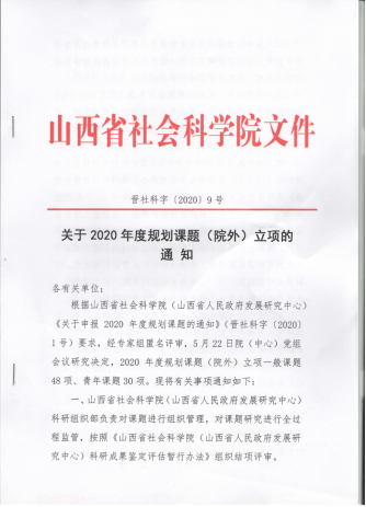 OK138太阳集团获批2020年度山西省社会科学院课题一项