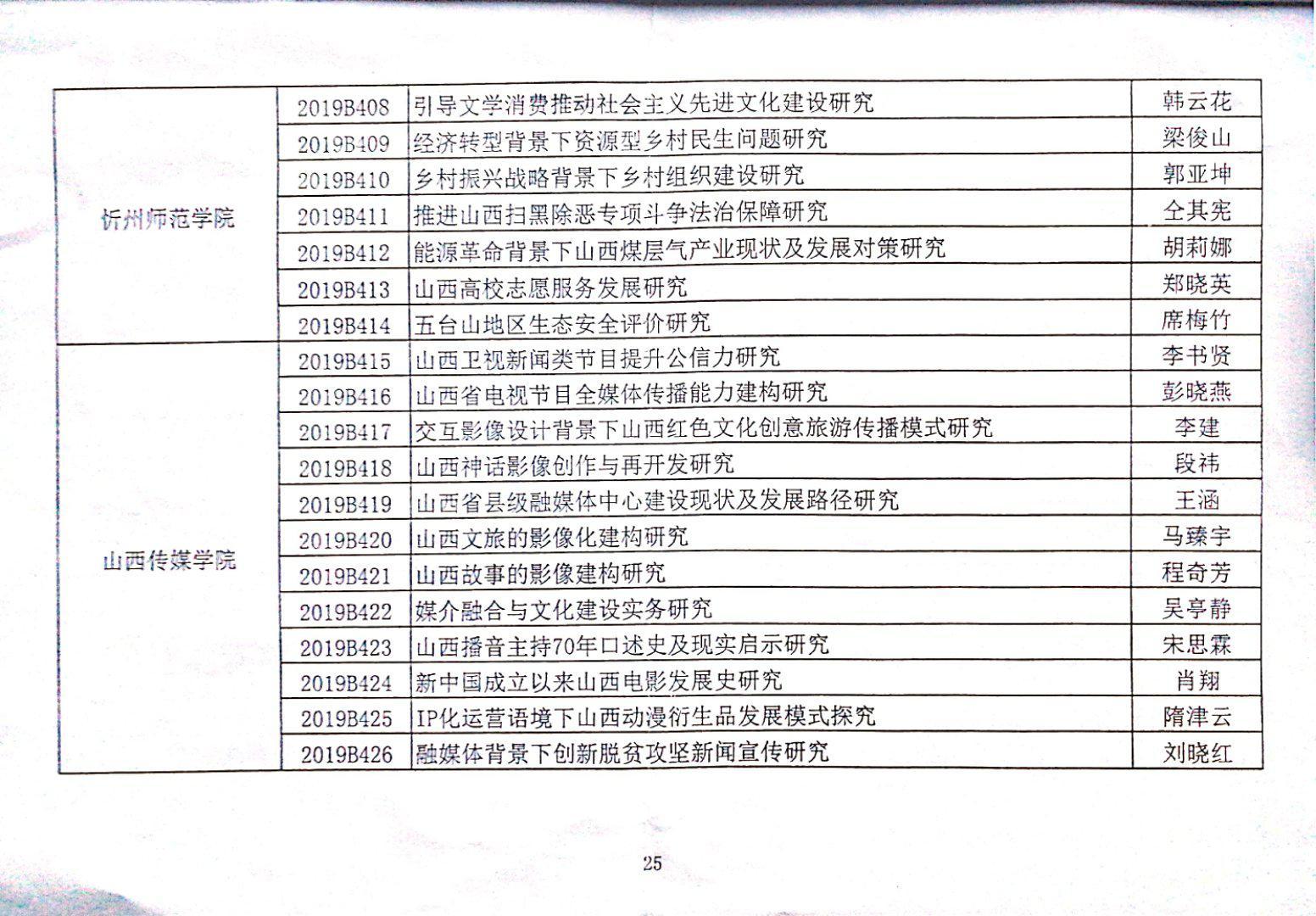 8月中旬,从科研处传来喜讯,经过单位申报、资格审核、专家评审、部务会审议,2019年度山西省哲学社会科学规划课题立项名单已出,我校14项课题立项,其中我院三名教师的课题立项。具体为宋思霖老师的《山西播音主持70年口述史及现实启示研究》、彭晓燕老师的《山西省电视节目全媒体传播能力建构研究》、李书贤老师的《山西卫视新闻类节目公信力调查研究》。