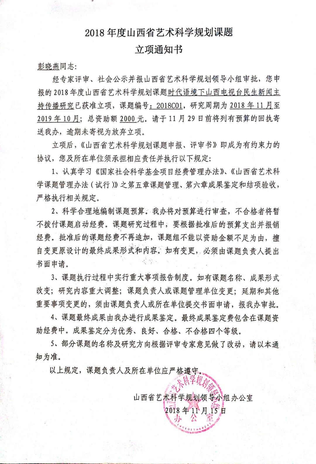 年度山西省艺术科学规划课题《时代语境下山西电视台民生新闻主持传播研究》,获准立项,课题编号为