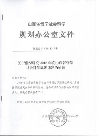 OK138太阳集团获批2018年度山西省哲学社会科学规划课题一项