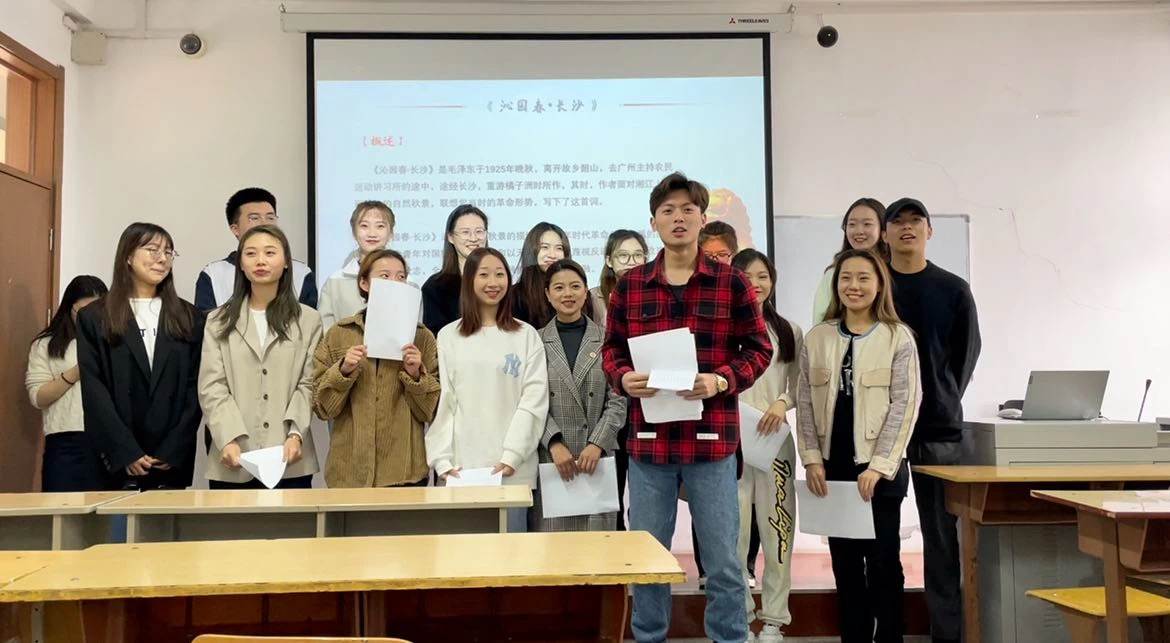 第二篇章,“颂党恩”。班级同学以专业课小组为单位,共同朗诵有关“党史的作品来歌颂庆祝党的百年华诞。第一组由刘新久、马文轩、张钦越等人朗诵——《沁园春·长沙》。第二组由梁启安、杨莉芹徐家丽等人朗诵——《可爱的中国》。第三组由屈晖、赵怡欣、焦子桉等人朗诵《党啊我们为您歌唱》。用声音歌颂党恩,用真情体味人生。同学们通过朗诵比拼,来表达自己对党的感激之情,情感真挚,令人动容。