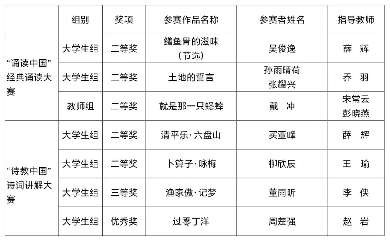 经过省赛和国赛的比拼,我院最终获得诵读大赛国赛二等奖3项;诗词讲解大赛国赛二等奖2项,三等奖1项,优秀奖1项。学校推荐我院获省赛优秀组织奖,推荐戴冲老师获省赛优秀组织个人奖。