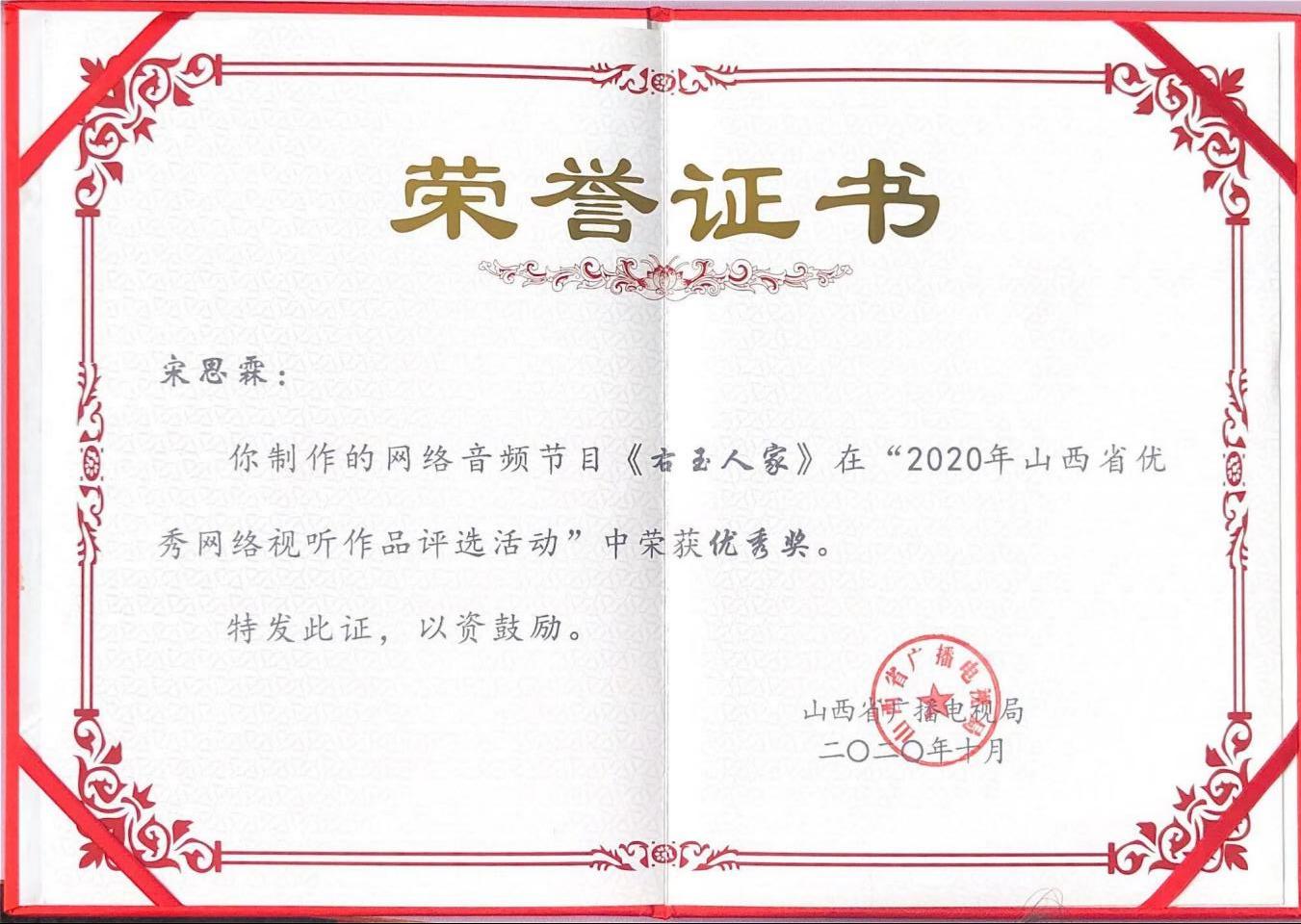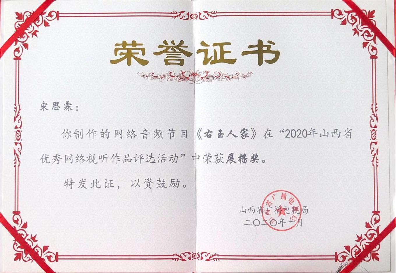 为引导和鼓励优秀网络听节目制作播出,不断提升网络视听节目内容品质,根据《关于开展2020年“弘扬社会主义核心价值观共筑中国梦”主題原创网络听节目征集推选和展播活动的通知》(广电办发「2020]31号)要求,山西省广播电视局组织开展了“2020年山西省优秀网络视听作品评选活动。评选活动由ok138太阳集团、黄河新网,山西新闻网负责承办。参评作品在黄河新网和山西新闻网等媒体网站进行了展播。经过专家的初评、复评,共有20部作品入国,并报送国家广播电视总局参与全国评选展播。此次评选活动对于弘扬主旋律,传播正能量,让人民群众共享网络视听繁荣发展成果具有重要的积极意义。我院“1331工程”协同创新项目成果——七集系列广播剧《右玉人家》再这次评选中,获得2020年山西省优秀网络视听作品奖。