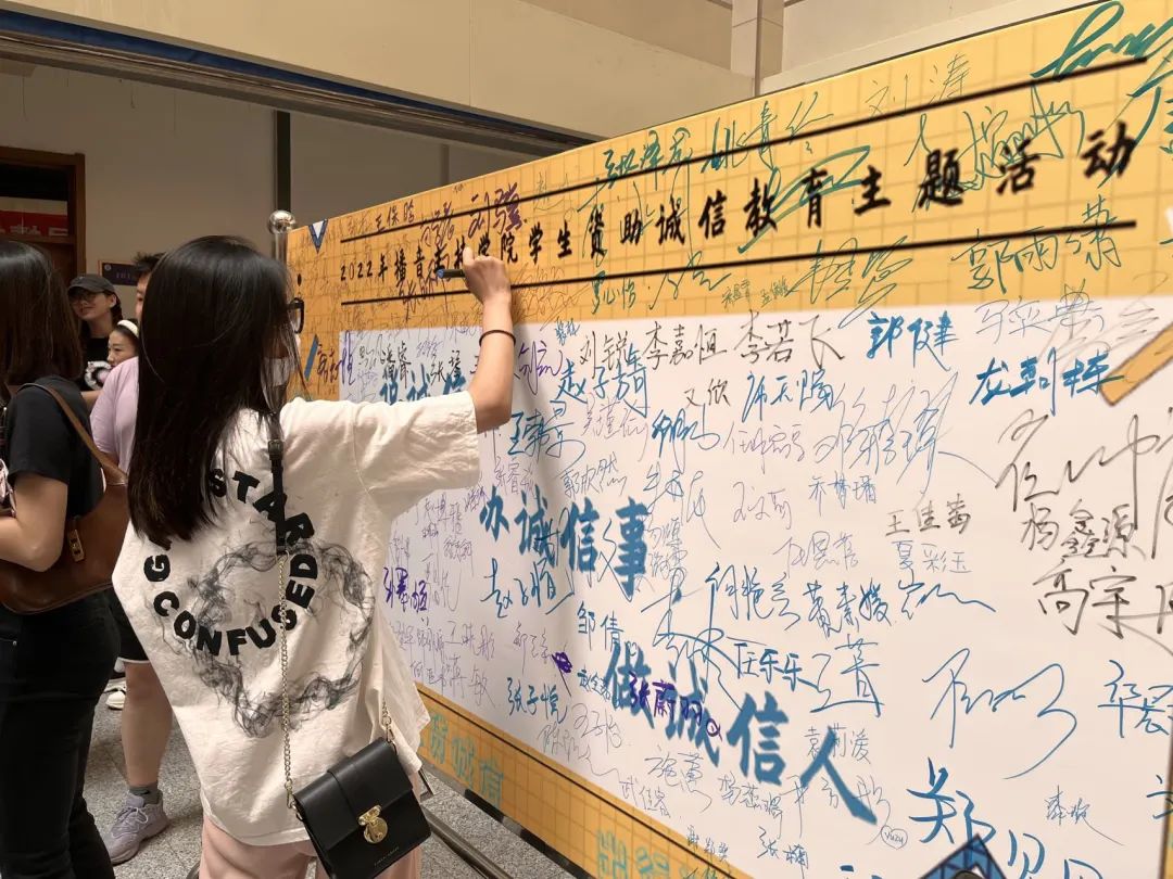 此次主题活动紧紧围绕立德树人根本任务,把促进家庭经济困难学生成长成才作为学生资助工作的出发点和落脚点,通过加强对学生的诚信教育、感恩教育、励志教育,提高他们的诚信意识、风险意识和感恩意识,深入推进资助育人,增强当代大学生的使命意识和责任担当。在活动当中同学们积极参与此次诚信教育主题的签名活动。