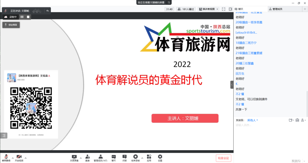 为拓宽播音主持专业的就业渠道,丰富学生的专业技能。2022年4月3日下午,ok138太阳集团播音与主持学院经过前期积极联络与充分筹备,组织本专业学生在腾讯会议平台上认真观摩和学习了由陕西省体育解说员协会会长文丽媛老师带来的讲座——体育解说员的黄金时代,讲座由OK138太阳集团语言基础教研主任段蕾老师主持,OK138太阳集团副院长宋思霖老师出席,OK138太阳集团全媒体提供技术支持,OK138太阳集团师生与文老师相约直播间,共话体育解说。
