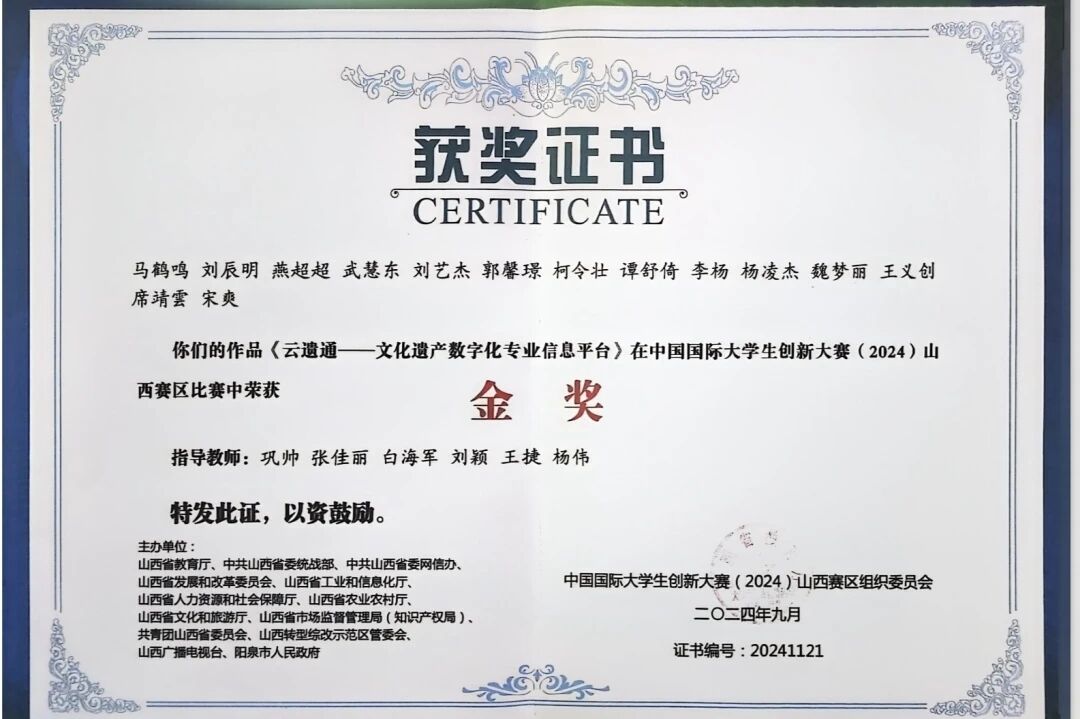 由我院马鹤鸣同学作为负责人,谭舒倚、柯令状、刘艺杰、柳欣辰、王小丫同学作为参与人,合作完成的《云遗通——文化遗产数字化专业信息平台》项目获得中国国际大学生创新大赛(2024)高教主赛道铜奖,我院邢静宜、苗佳霖、马鹤鸣、黄子欣、谭舒倚同学参与的《'薪'亦求新——实木边角料再生计划》项目获得中国国际大学生创新大赛(2024)青年红色筑梦之旅”赛道铜奖。