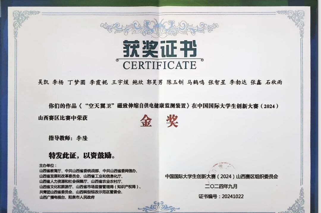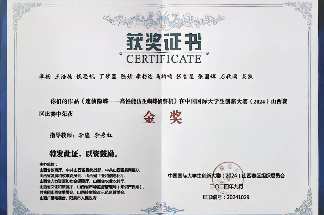 同时马鹤鸣同学负责、参与的项目《云遗通——文化遗产数字化专业信息平台》《“空天翼卫”磁致伸缩自供电健康监测装置》《速侦隐蝶——高性能仿生蝴蝶侦察机》在本次大赛中均荣获山西赛区金奖。