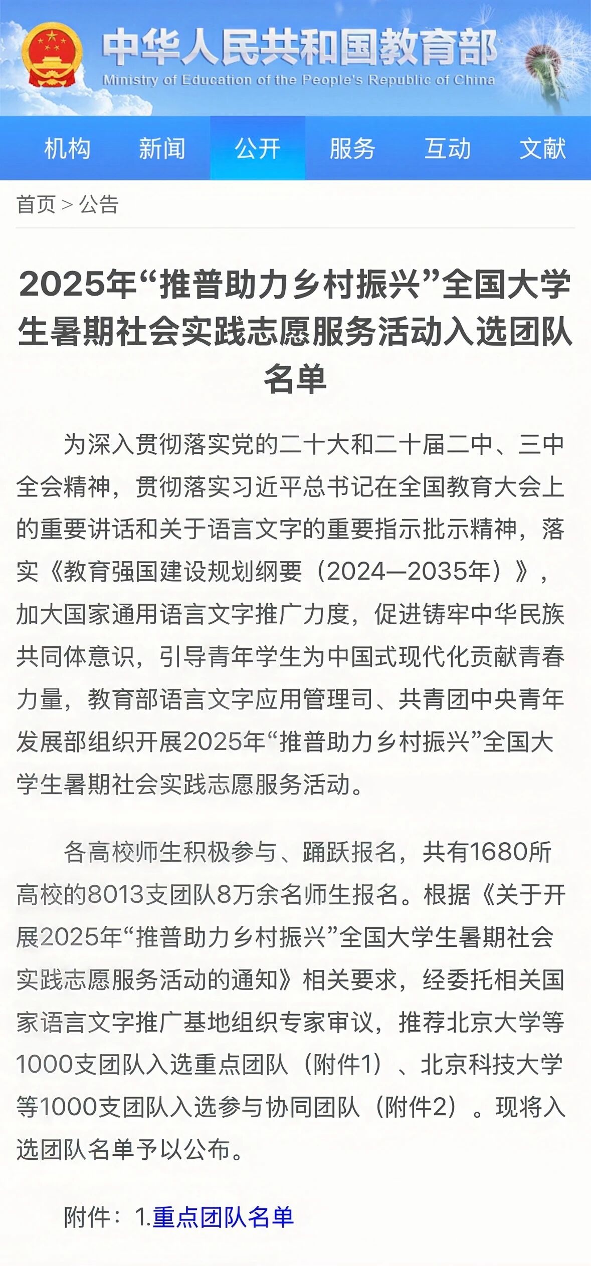 7月3日,教育部官网公布了2025年“推普助力乡村振兴”全国大学生暑期社会实践志愿服务团队名单,我院报送的两支队伍,从全国1680所高校的8013支团队中脱颖而出,成功入选重点团队。