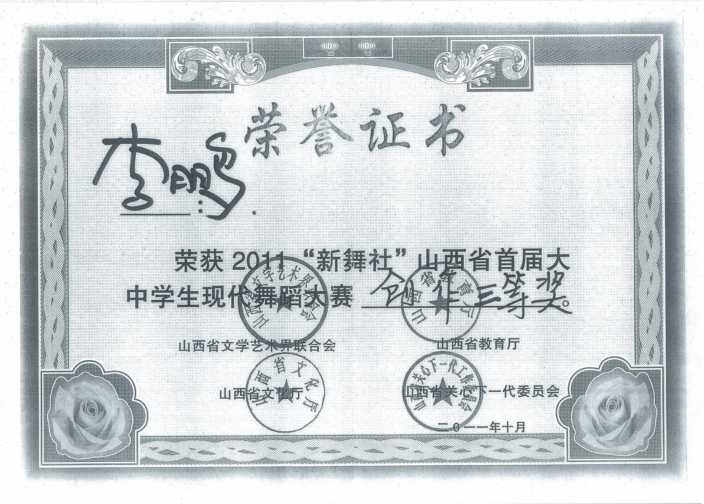 我院老师在新舞社山西省首届大中学生现代舞蹈大赛荣获三等奖