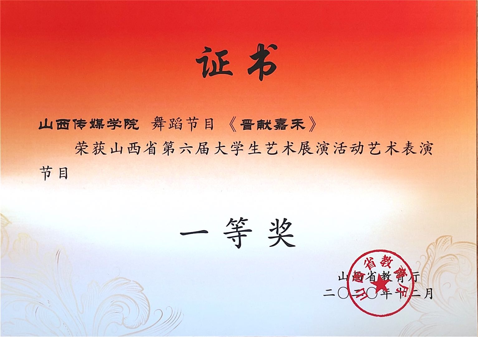 我院舞蹈节目《晋献嘉禾》荣获山西省第六届大学生艺术展演活动艺术表演节目一等奖