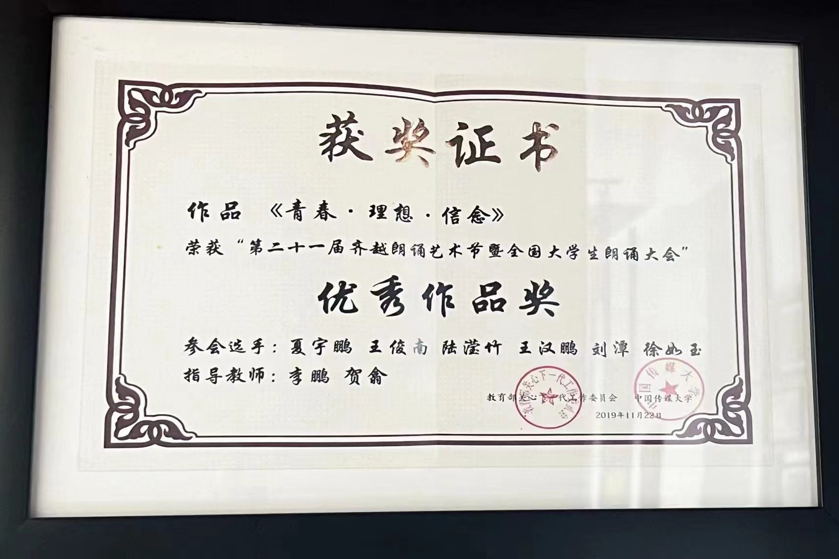 我院作品《青春·理想·信念》荣获第二十一届齐越朗诵艺术节暨全国大学生朗诵大会“优秀作品奖”