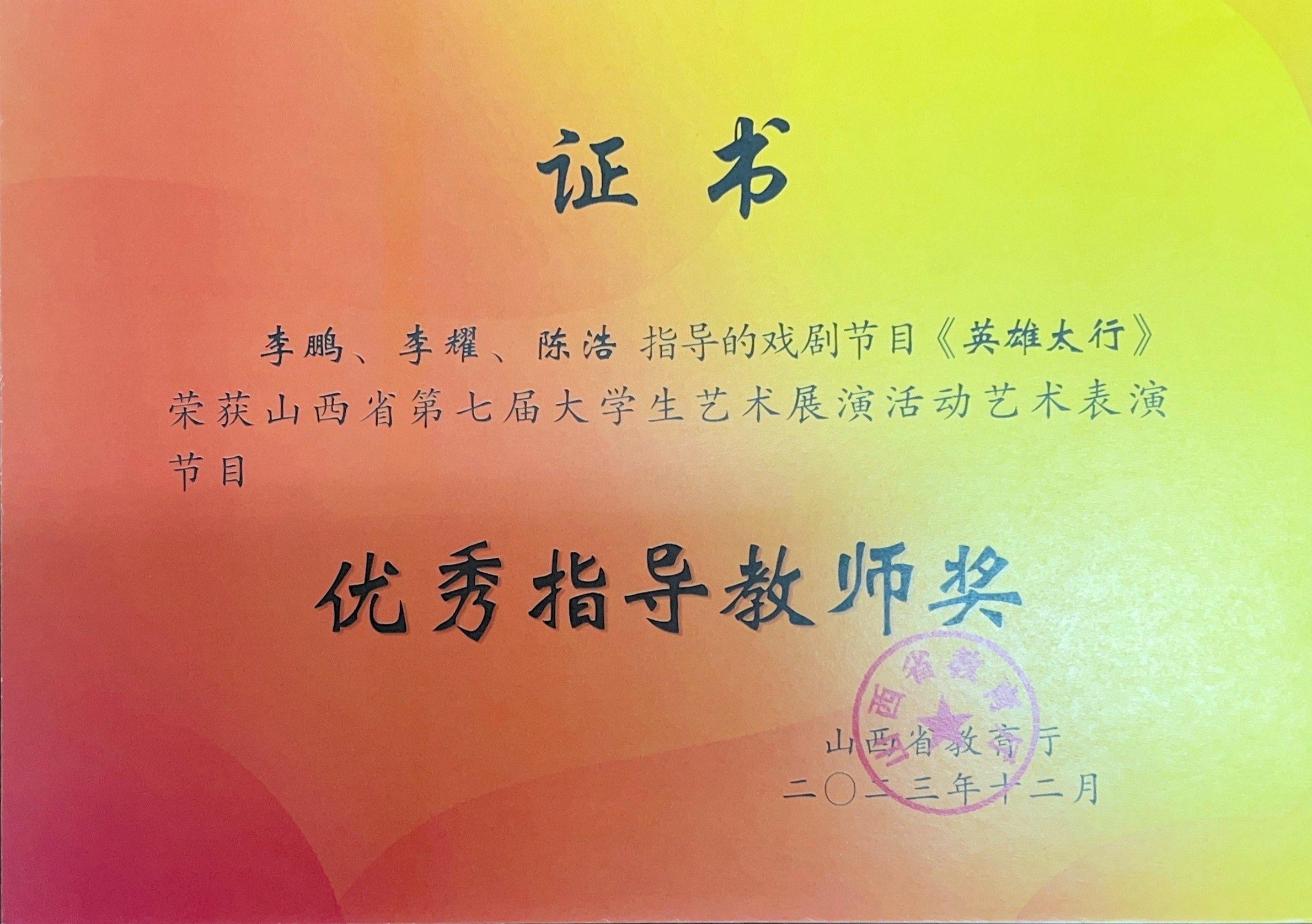 我院教师指导的戏剧节目《英雄太行》荣获山西省第七届大学生艺术展演活动“优秀指导教师奖”