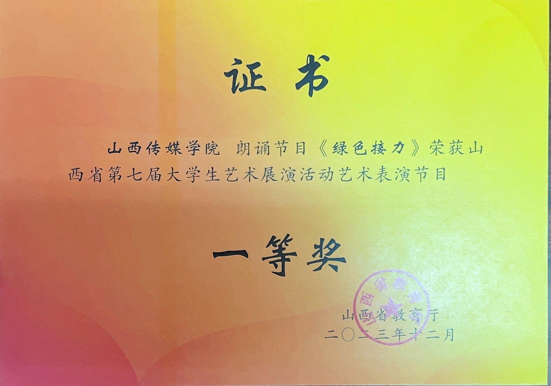 我院朗诵节目《绿色接力》荣获山西省第七届大学生艺术展演活动艺术表演节目一等奖
