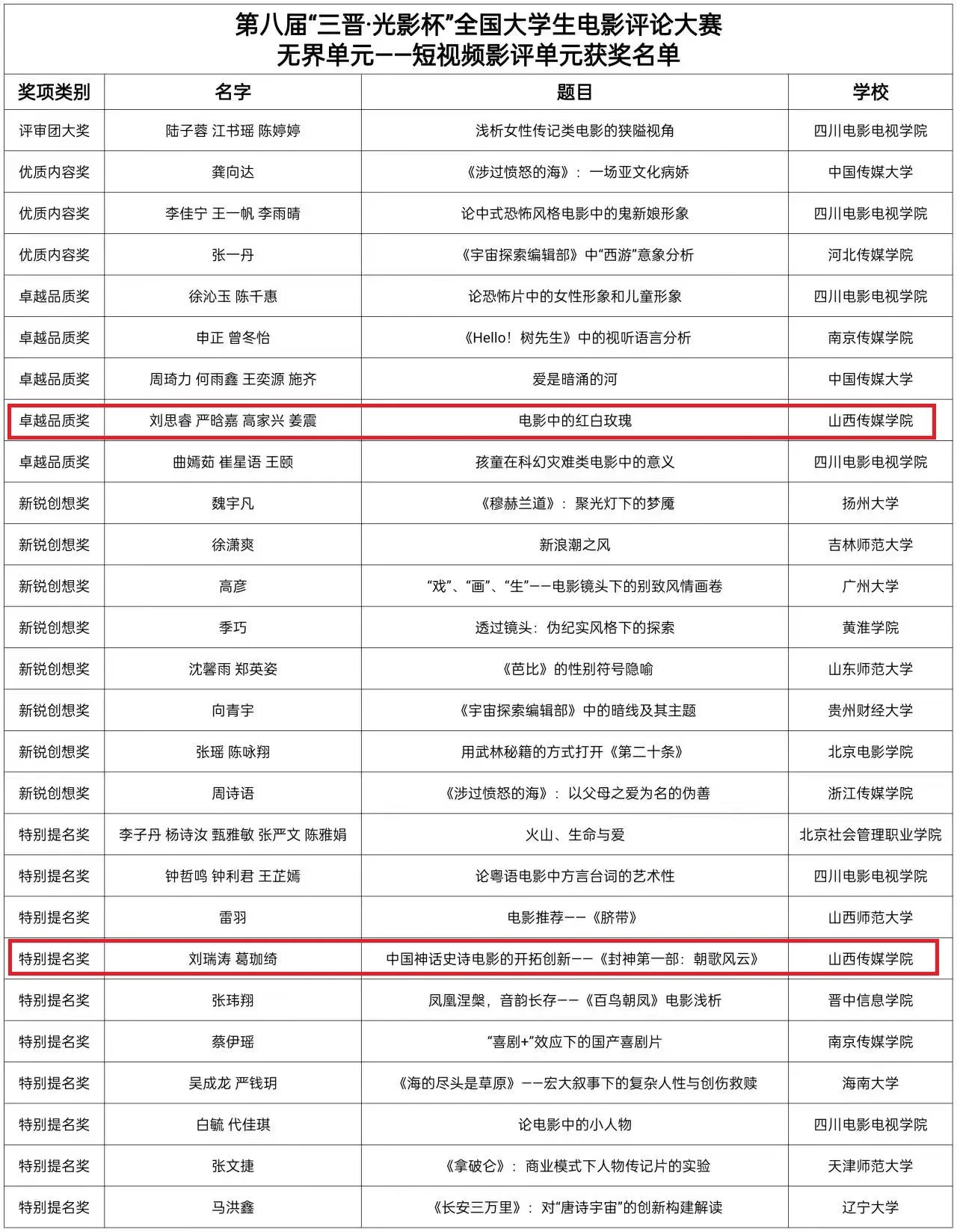 我院同学在“三晋·光影杯”全国大学生电影评论大赛中分别获得“卓越品质奖”、“特别提名奖”