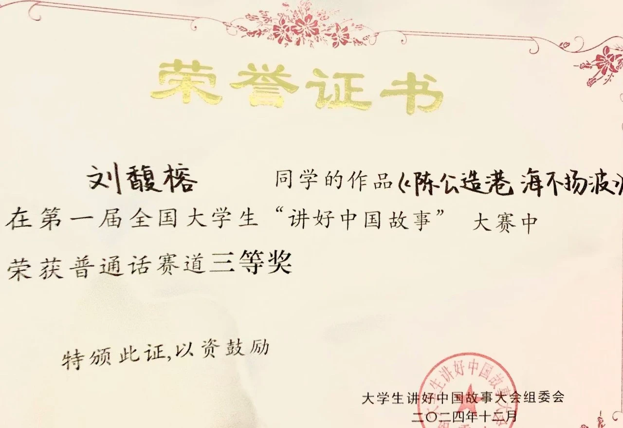 我院学子刘馥榕荣获第一届大学生“讲好中国故事”大会普通话赛道三等奖
