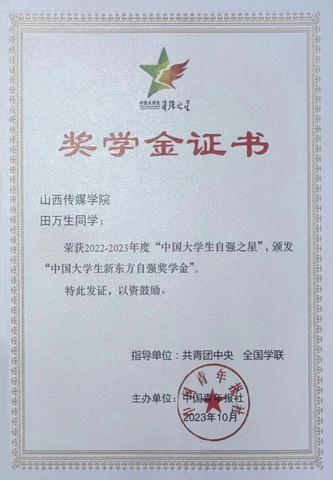 由共青团中央、全国学联指导、中国青年报社、新东方教育科技集团、中国青年创业就业基金会联合举办的2022年度“中国大学生自强之星”奖学金推报活动,经校级推荐、省级推荐、全国评审等环节,我校学子2020级播音与主持艺术一班田万生荣获2022-2023年度“中国大学生自强之星”称号。