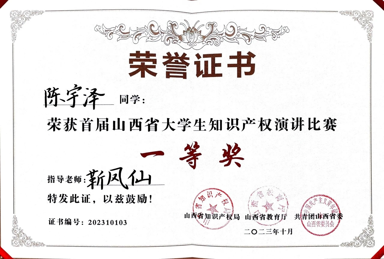 为推进知识产权文化建设,促进全社会更加了解和重视知识产权,10月29日,由省知识产权局、省教育厅、团省委等有关单位共同举办的首届山西省大学生知识产权演讲比赛决赛在太原理工大学举行。经过各学校报名推荐、复赛、预决赛和决赛的层层选拔,我校学子陈宇泽荣获首届山西省大学生知识产权演讲比赛一等奖;刘馥榕荣获首届山西省大学生知识产权演讲比赛二等奖;我校荣获首届山西省大学生知识产权演讲比赛优秀组织奖。