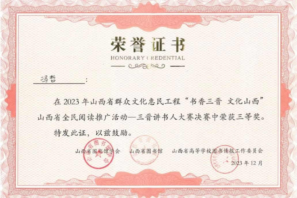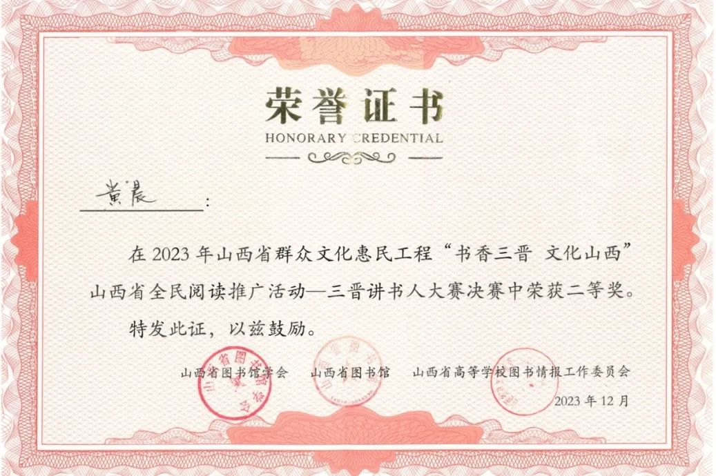 经过前期初赛和复赛两轮选拔,共有来自全省的46名选手晋级决赛。我院2022级学生黄晨和2021级学生冯哲,代表学校参赛并晋级决赛,凭借赛前的充分准备和现场的出色发挥,分别获得本次大赛的二、三等奖,我校图书馆荣获2023年度山西省全民阅读“优秀单位”荣誉。