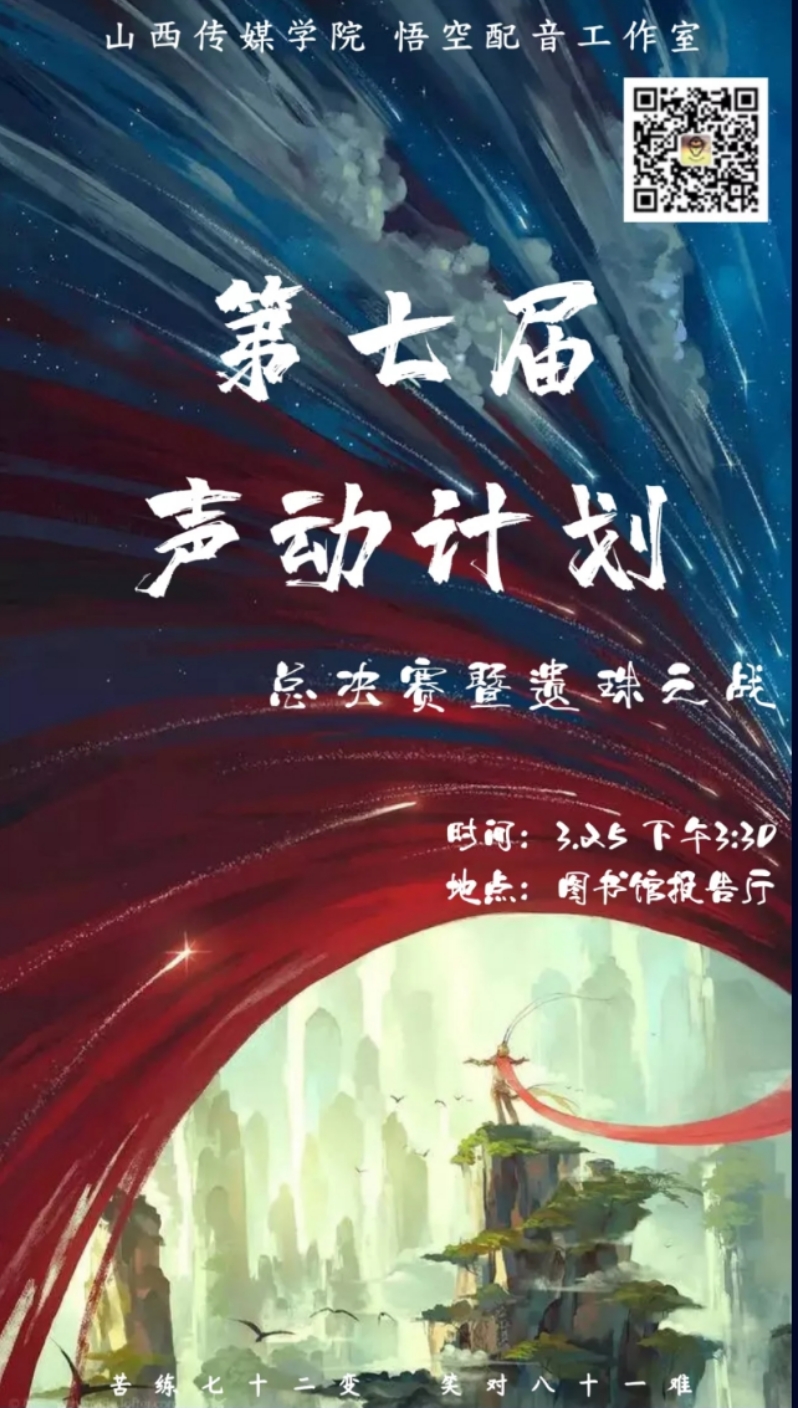 大家好!ok138太阳集团悟空配音工作室325日(星期四)下午330于图书馆报告厅举行第七届声动计划暨第六届遗珠之战决赛。