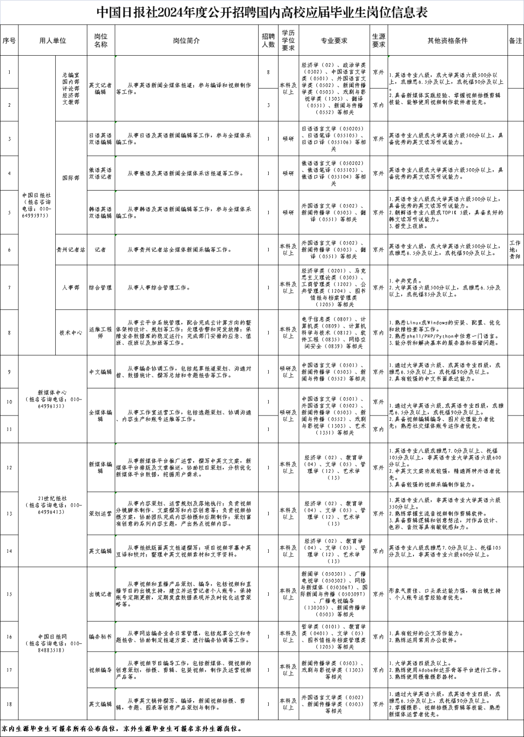四、招聘岗位及资格条件此次招聘涉及18个岗位、计划招聘27人,具体岗位及资格条件详见《中国日报社2024年度公开招聘国内高校应届毕业生岗位信息表》,京内生源毕业生可报名所有公布岗位,京外生源毕业生可报名京外生源岗位。其中,有关岗位专业条件参考教育部公布的专业目录(《普通高等学校本科专业目录》和《授予博士、硕士学位和培养研究生的学科、专业目录》)。报名应聘人员在报名时对专业有任何疑问的,可以直接拨打报名咨询电话进行咨询了解。