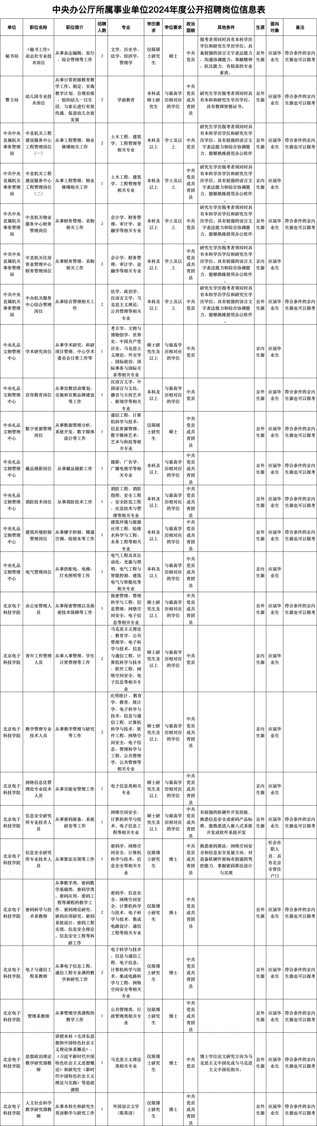 此次招聘涉及25个岗位、计划招聘35人(应届毕业生34人、社会在职人员1人),具体岗位及资格条件详见《中央办公厅所属事业单位2024年度公开招聘岗位信息表》。其中,有关岗位专业条件参考教育部公布的专业目录(《普通高等学校本科专业目录》和《授予博士、硕士学位和培养研究生的学科、专业目录》)。报名应聘人员在报名时对专业有任何疑问的,可以直接拨打报名咨询电话进行咨询了解。