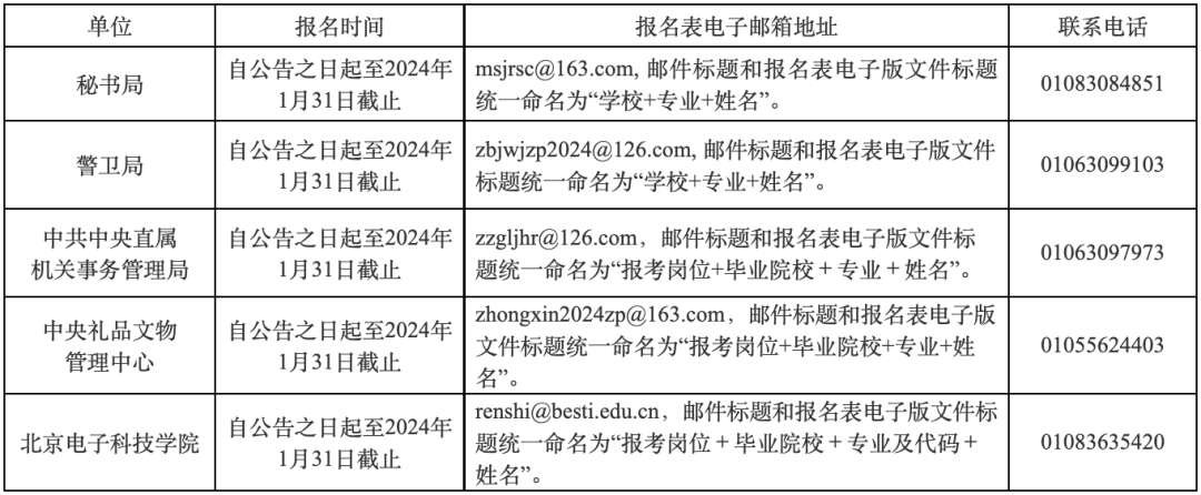 秘书局笔试名单于2024年4月底前电话通知,警卫局笔试名单于2024年3月1日前电话通知,中共中央直属机关事务管理局笔试名单于2024年2月25日前电话通知,中央礼品文物管理中心笔试名单于2024年2月28日前电话通知,北京电子科技学院笔试名单于2024年3月10日前电话通知。未进入笔试名单的,不再通知。