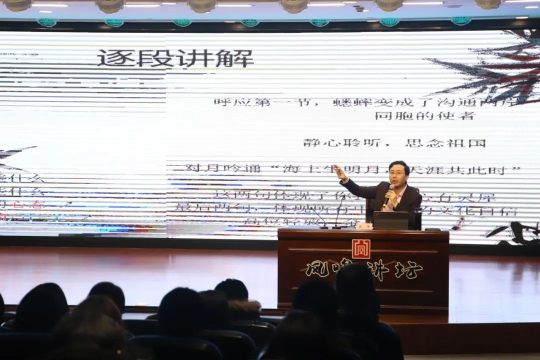 讲座中,戴冲老师讲解了自由诗的概念、特点、分类以及其创作规律,观摩瞿弦和、徐涛两位老师的朗诵视频,以《就是那一只蟋蟀》为例解析现代诗朗诵的技巧。