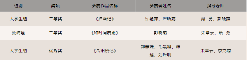 经过省赛和国赛的比拼,我院最终获得诵读大赛国赛二等奖2项,优秀奖1项;诗词讲解大赛国赛一等奖1项,二等奖1项,三等奖3项,优秀奖2项。学校推荐我院和人文学院参与评选省赛优秀组织奖,推荐彭晓燕、王露老师参与评选省赛优秀组织个人奖。