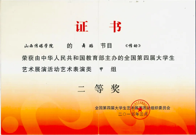 我院吾舞现代舞团表演的作品《悸动》曾荣获全国第四届大学生艺术展演活动艺术表演类甲组二等奖。