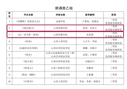 2023年12月,在山西省第七届大学生艺术展演活动中,我院报送的作品《英雄太行》获得戏剧类甲组一等奖、优秀节目创作奖和优秀指导教师奖,《绿色接力》和《这一双手那一抹绿》均获得朗诵类乙组一等奖、优秀节目创作奖及优秀指导教师奖,《粟之歌》获得舞蹈类甲组二等奖和优秀指导教师奖。展演活动充分彰显了我院朝气蓬勃的文化艺术氛围,多角度展示了我院艺术教育工作成果,推动我院的教育教学工作再上了一个新台阶。